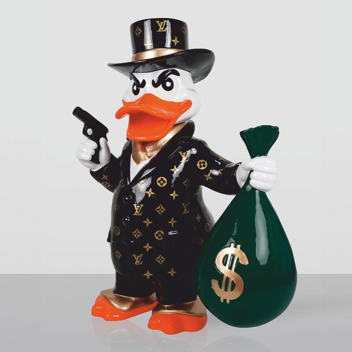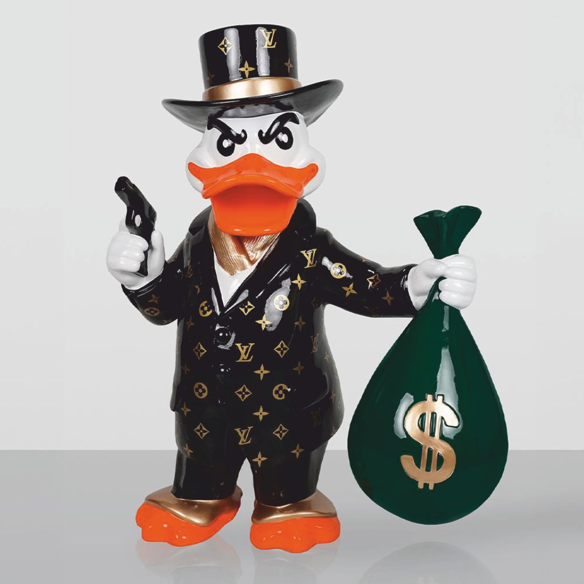Diese außergewöhnliche Enten-Skulptur präsentiert sich als originelles Kunstobjekt mit starkem Charakter und setzt markante Akzente im Innen- wie auch im Außenbereich. Die großformatige Figur zeigt eine Ente im eleganten Anzug mit klassischem Zylinder und verleiht ihr damit eine humorvolle, zugleich stilvolle Ausstrahlung mit fast aristokratischem Charme. Der Geldsack in der linken Hand sowie die Pistole in der rechten setzen bewusst kontrastierende Akzente und verleihen der Skulptur eine überraschende, ausdrucksstarke Präsenz.