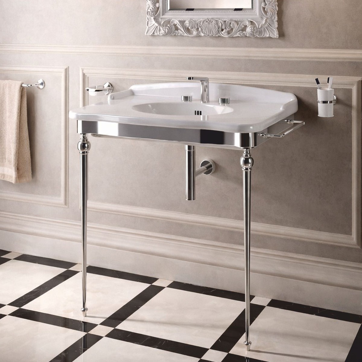 Hergestellt aus hochwertiger weißer Keramik und kombiniert mit sorgfältig ausgearbeiteten silberfarbenen Metallelementen, überzeugt dieser Waschtisch durch eine klare, zugleich luxuriöse Erscheinung. Die glatte Keramikoberfläche bietet nicht nur eine edle Optik, sondern auch hohe Alltagstauglichkeit dank ihrer pflegeleichten und langlebigen Beschaffenheit. Die silbernen Akzente sorgen für eine dezente, elegante Betonung des Designs.
