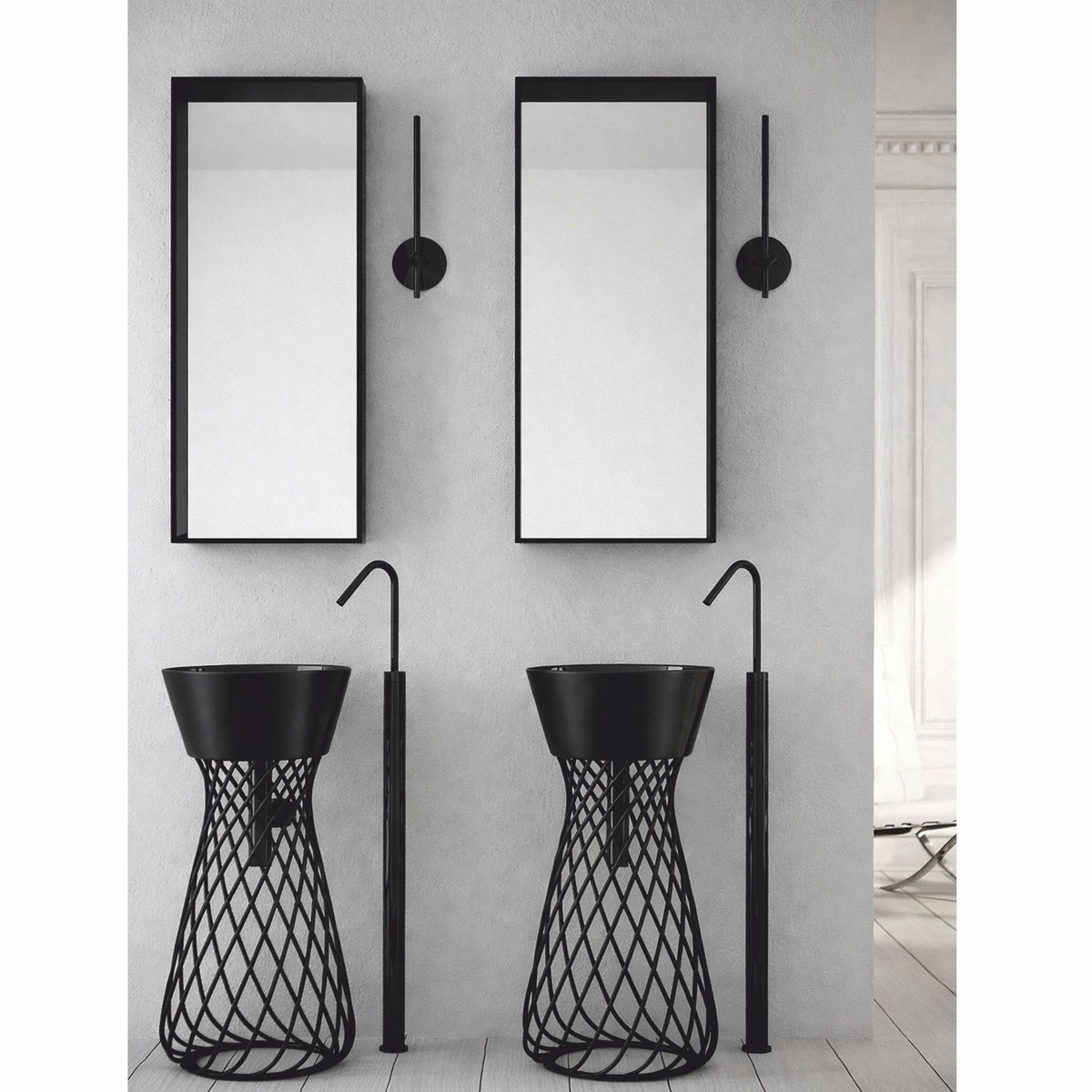 Gefertigt aus hochwertiger schwarzer Keramik überzeugt das Luxus Waschbecken durch seine edle Oberfläche, hohe Widerstandsfähigkeit und eine besonders pflegeleichte Struktur. Der formschöne Metallständer in Schwarz ergänzt das Gesamtbild harmonisch und bietet zugleich eine stabile, ausgewogene Konstruktion mit zeitgemäßer Leichtigkeit.