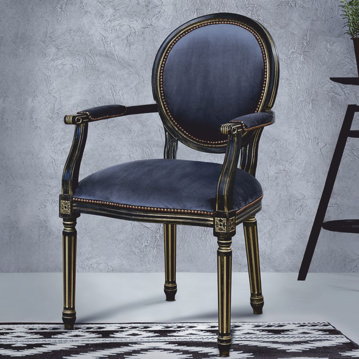 Elaborately handcrafted, the chair combines classic design with sophisticated craftsmanship and timeless style. The seat, backrest, and armrests are covered in a noble, blue velvet fabric, whose velvety texture and deep color nuances create a fascinating play of light, elegance, and depth. The frame made of black lacquered solid wood, accentuated by golden decorations, gives the piece its unmistakable baroque character and creates an ambience of splendor and harmony.