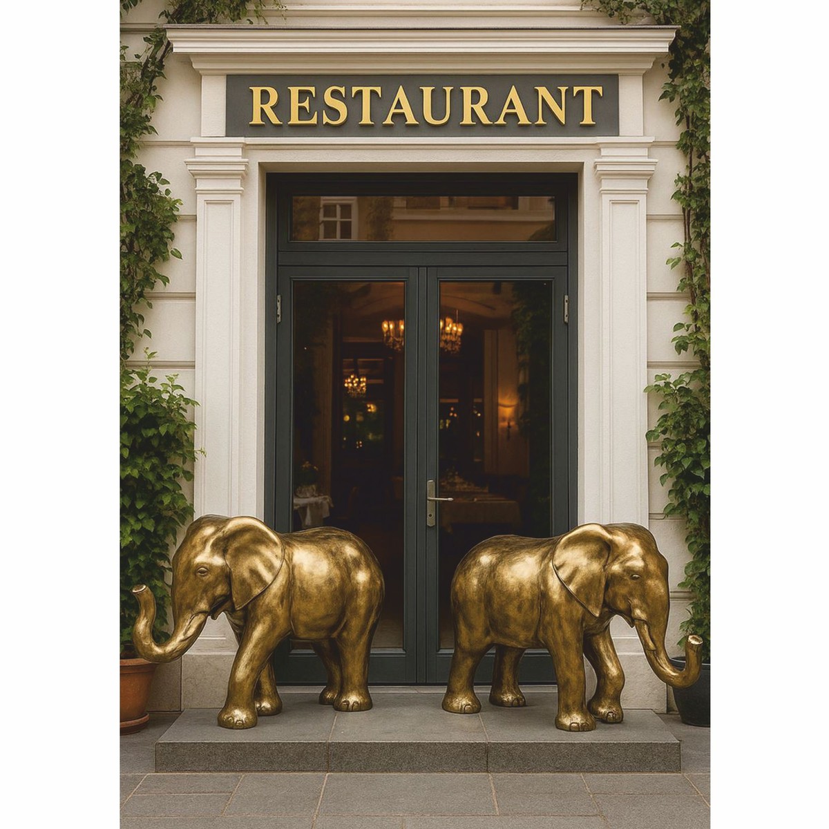 Con esta impresionante escultura decorativa de "Elefante", Casa Padrino presenta un exclusivo objeto de diseño que combina de forma impresionante elegancia, simbolismo y artesanía. La gran figura está hecha de resina sintética resistente a la intemperie y fibra de vidrio, y destaca por su elegante acabado dorado antiguo, aportando un toque lujoso y elegante a cualquier estancia.