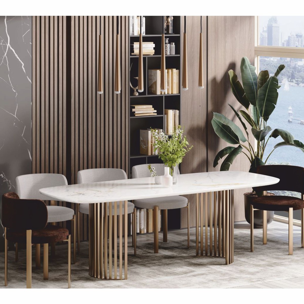 El elegante tablero de mármol blanco le confiere un aspecto brillante y sofisticado, y se caracteriza por su superficie resistente y de fácil mantenimiento. El tablero se apoya en dos patas metálicas de color latón con una hermosa forma, que aportan un toque de lujo y garantizan estabilidad y una apariencia equilibrada. La exquisita artesanía, cuidada hasta el más mínimo detalle, subraya los altos estándares de calidad de esta mesa de comedor de Casa Padrino.