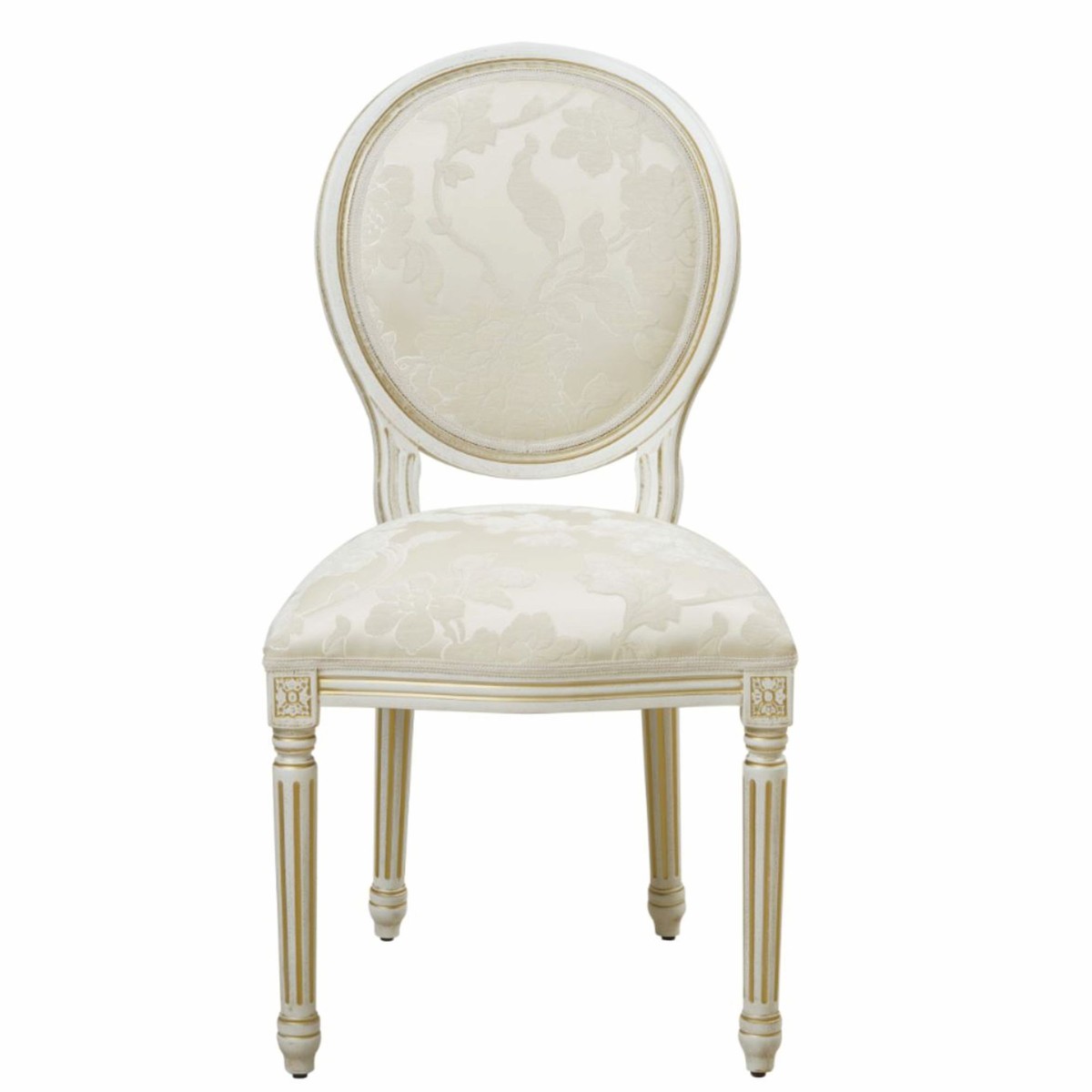 Elaborada artesanalmente con esmero, esta lujosa silla combina elementos barrocos clásicos con un toque de elegancia moderna. El respaldo y el asiento están tapizados en una fina tela blanca estampada, cuya sutil textura y apariencia de alta calidad captan la atención de inmediato. La estructura de madera maciza lacada en blanco, realzada con detalles dorados, acentúa las líneas fluidas y le confiere a la silla una presencia sofisticada y armoniosa.