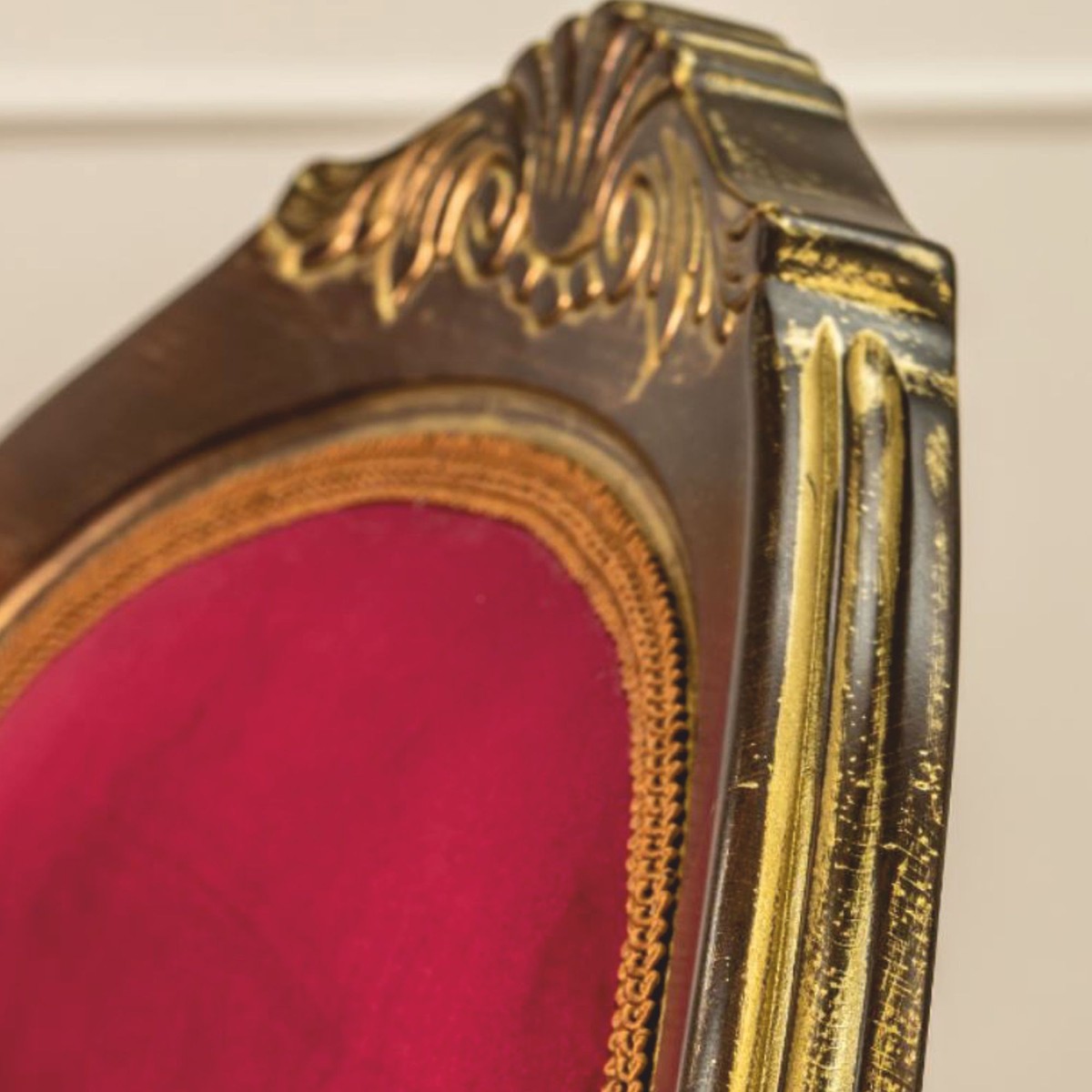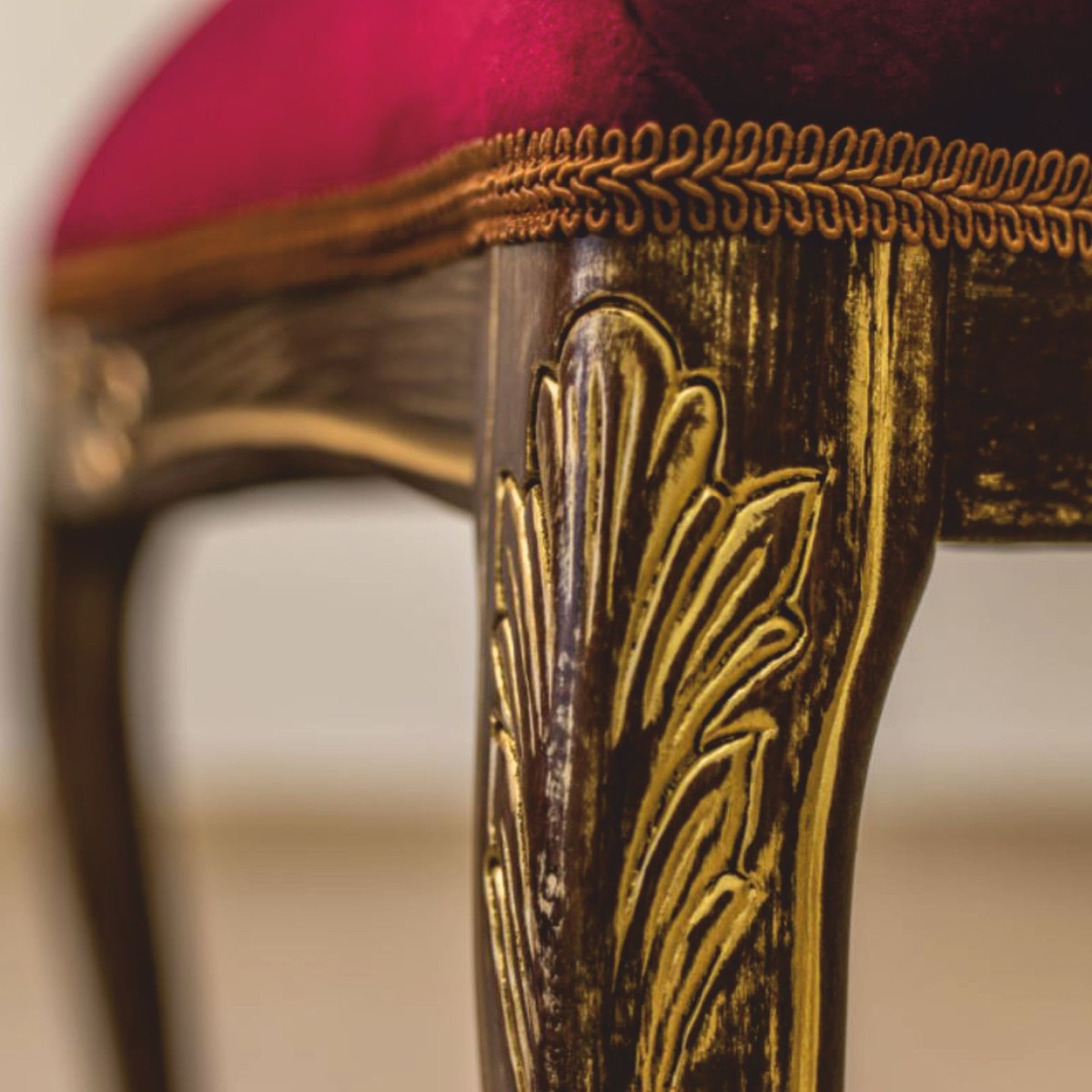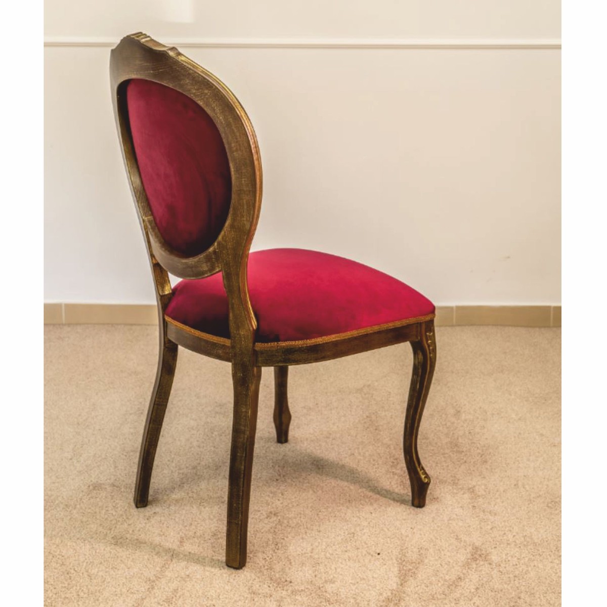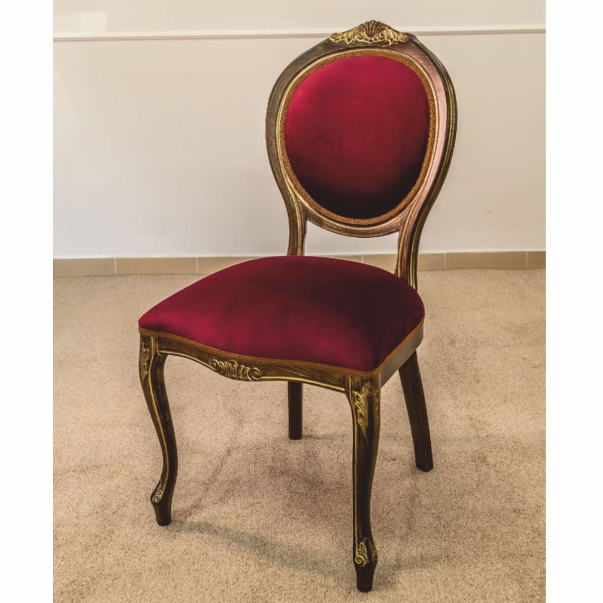 Fabricada con meticuloso cuidado, la silla presenta una suntuosa tapicería de terciopelo burdeos, cuya fina textura y rico color llaman la atención de inmediato. La ingeniosa estructura de madera maciza en un cálido tono marrón, acentuada por adornos dorados, enfatiza las líneas fluidas y le otorga una presencia digna, casi majestuosa.