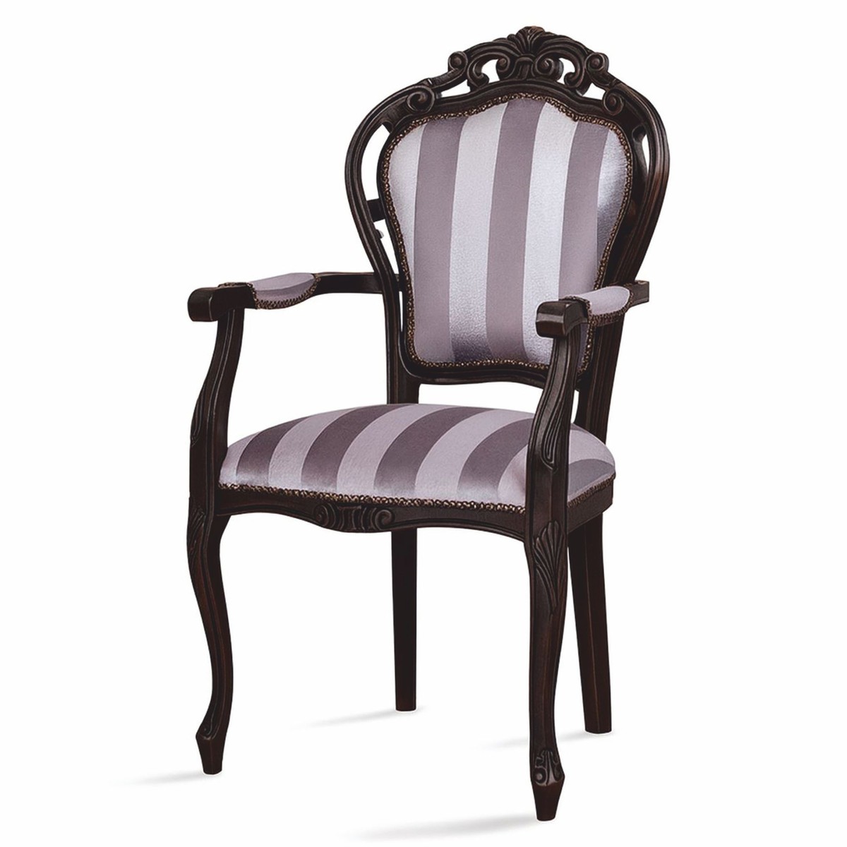 La silla está tapizada en una tela de rayas moradas, cuyos elegantes matices de color y su refinada textura crean un efecto impactante y majestuoso. La estructura de madera maciza marrón oscuro acentúa los contornos curvos del diseño y le otorga una presencia noble que resulta tanto estéticamente impactante como estilísticamente convincente.