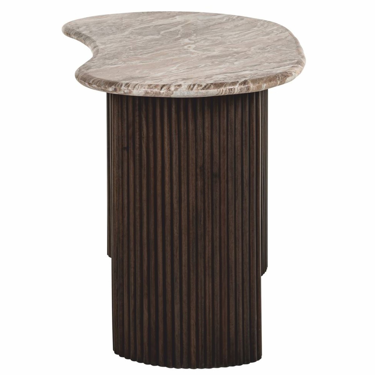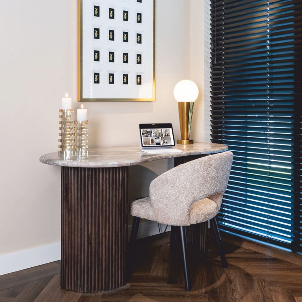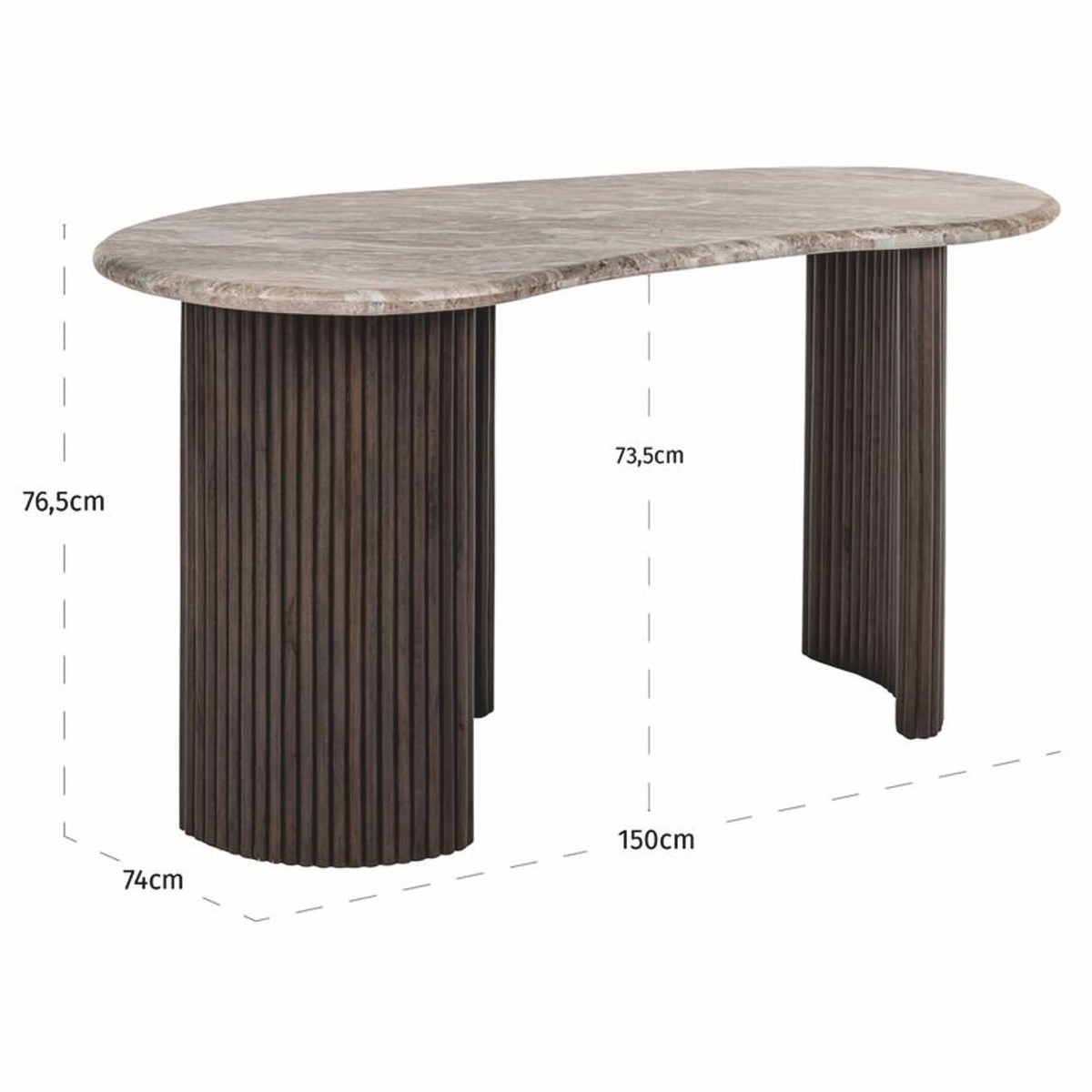 Son plateau incurvé en marbre beige sophistiqué confère au bureau une légèreté luxueuse et souligne son élégance intemporelle. Il repose sur des pieds artistiquement incurvés, finition brun foncé, qui assurent stabilité et une présence élégante et remarquable.