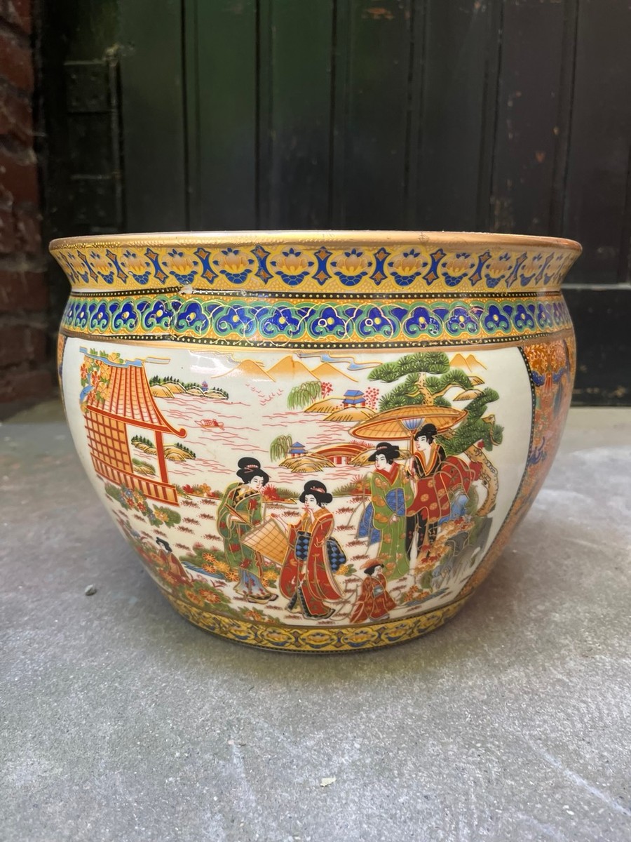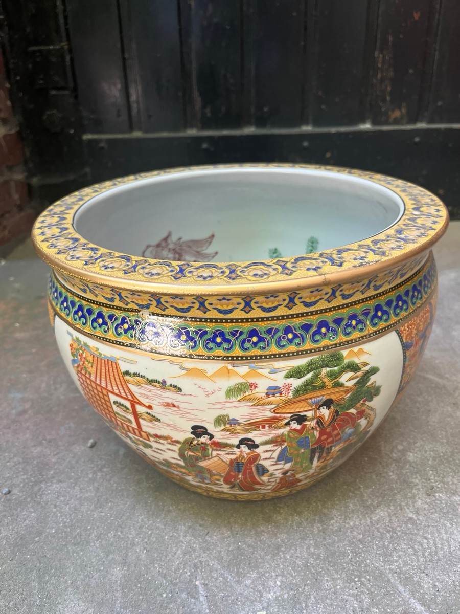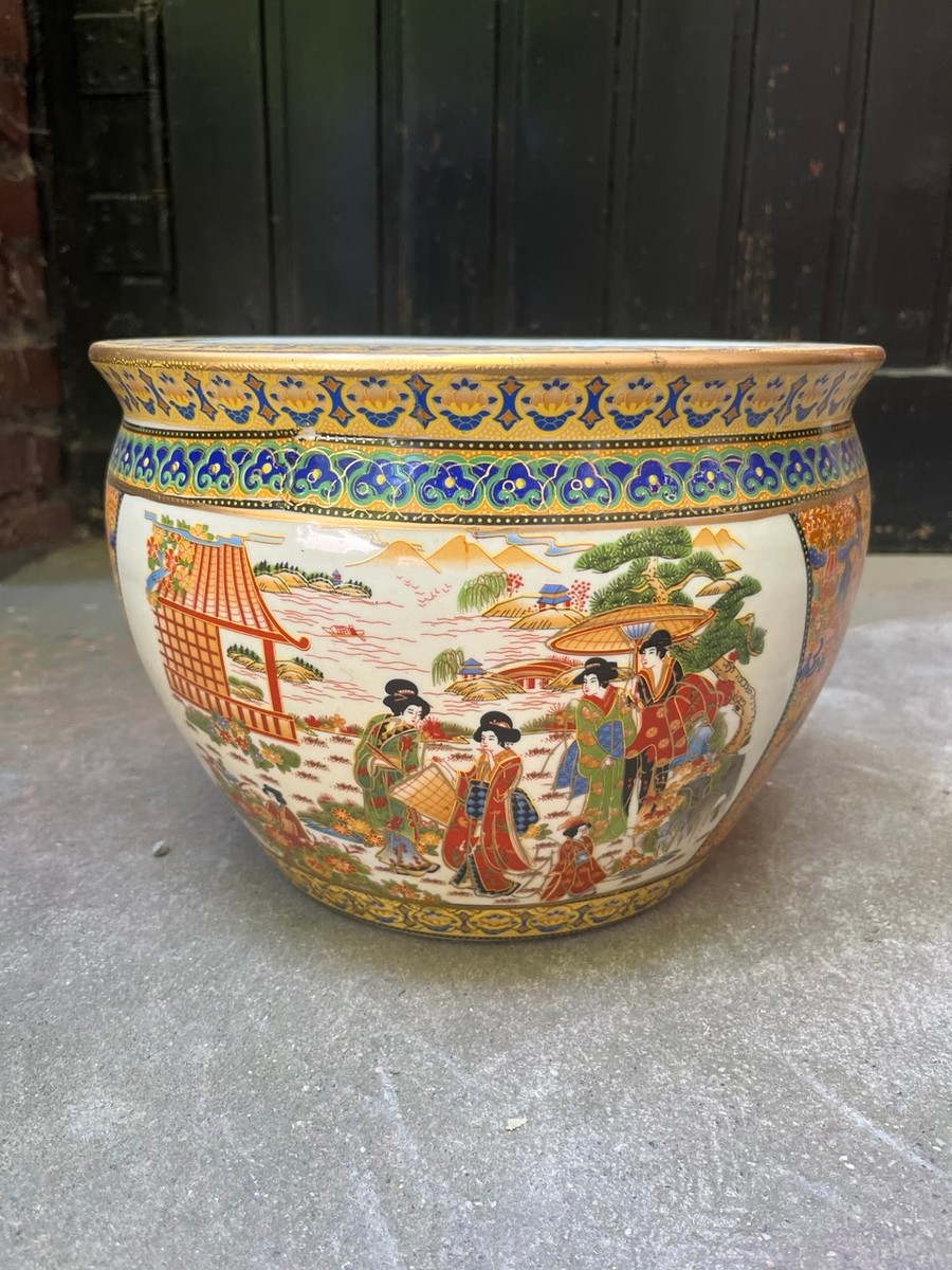 Diese kunstvoll gearbeitete Porzellanvase verbindet klassische asiatische Malerei mit dekorativer Funktionalität. Die Außenseite zeigt eine lebendige Szene mit Figuren und Landschaften in leuchtenden Farben, kunstvoll gerahmt von einem goldverzierten Rand. Die massive Ausführung macht die Vase ideal für Boden- oder Tischdekoration – als Blumenvase, Pflanzgefäß oder stilvolles Einzelstück im Raum.