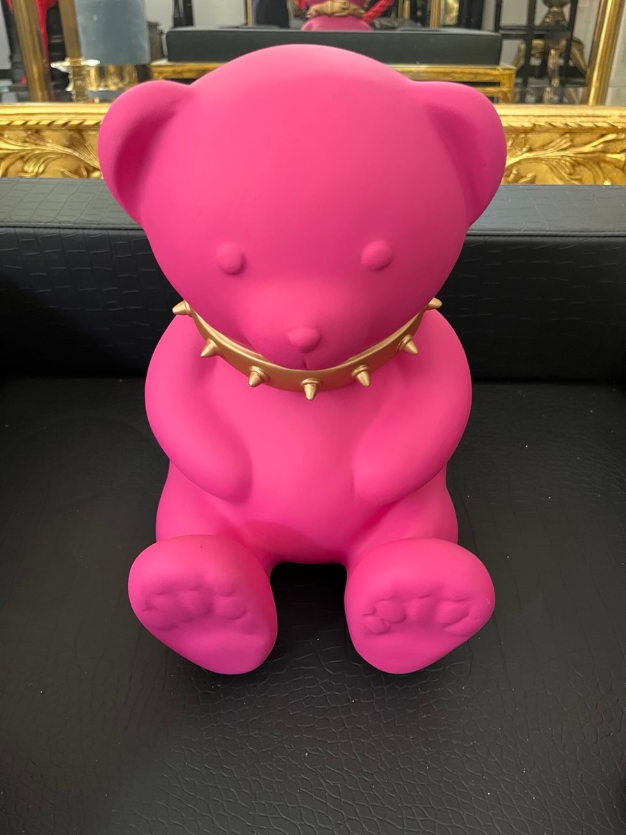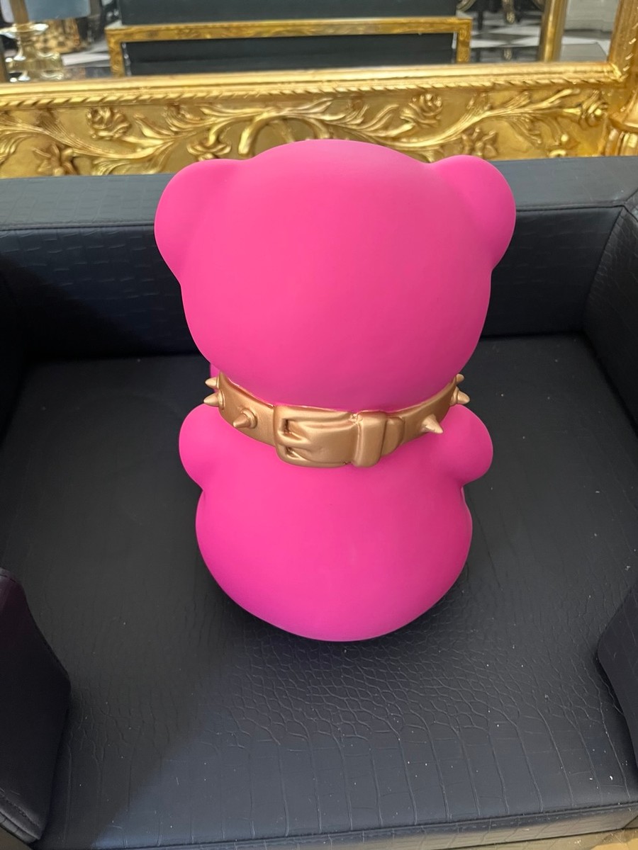 Diese auffällige Dekofigur von Casa Padrino vereint verspielten Charme mit modernem Design. Der stilisierte Teddybär in kräftigem Pink wird durch ein goldfarbenes Halsband mit markanten Nieten stilvoll ergänzt. Ob als Eyecatcher im Wohnzimmer, in Boutiquen oder modernen Interieurs – dieser Bär ist ein echtes Statement-Piece.
