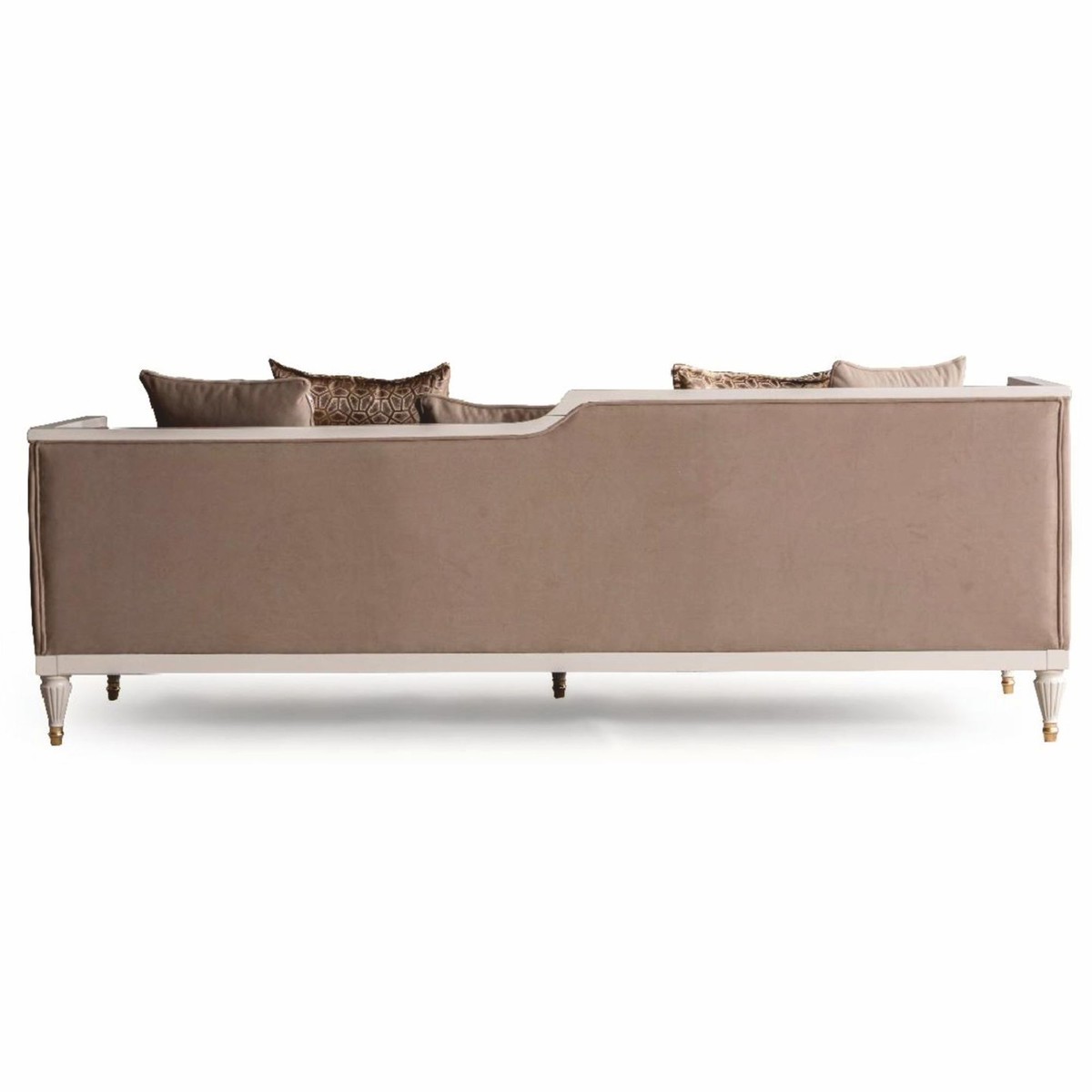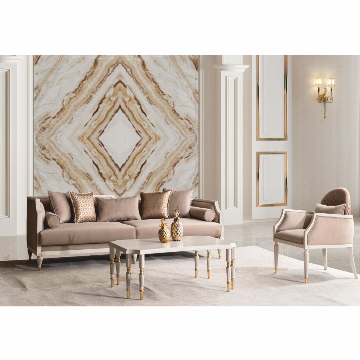 L'elegante rivestimento in tessuto marrone conferisce al divano barocco un'atmosfera calda e lussuosa, garantendo al contempo un comfort di seduta eccezionale. La struttura in legno massello color crema, meticolosamente lavorata, è impreziosita da elementi in metallo color oro, che sottolineano il carattere sofisticato di questo esclusivo mobile.