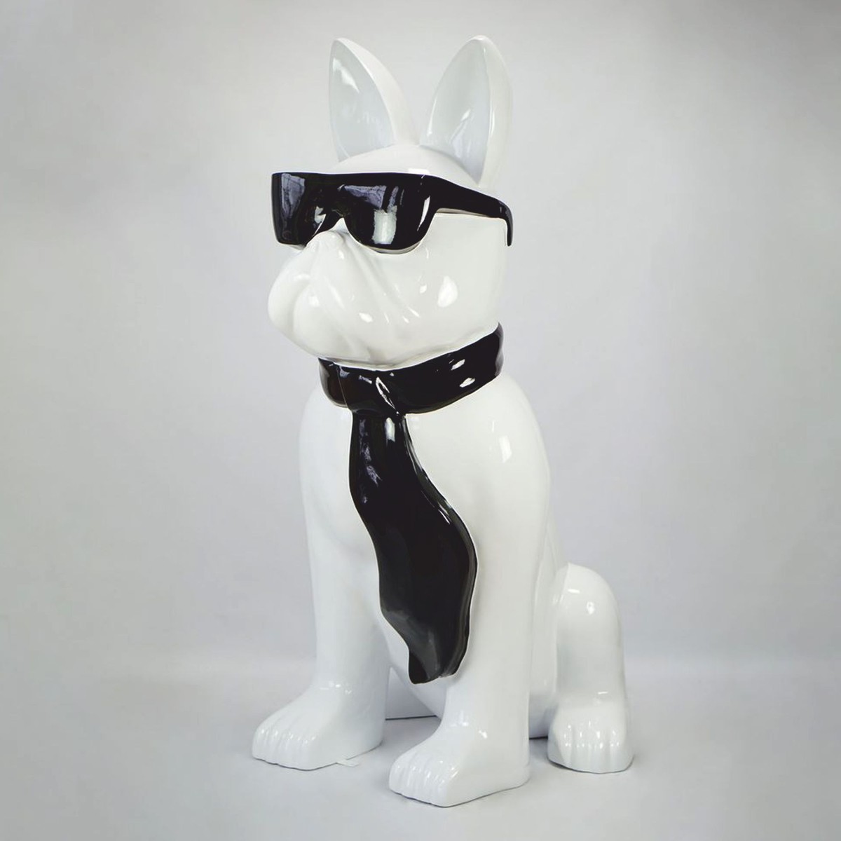 Rifinito in bianco e dotato di occhiali da sole neri e cravatta nera coordinata, questo affascinante bulldog trasuda casualità urbana e stile moderno. Dona personalità a qualsiasi ambiente, che sia il soggiorno, l'ingresso, il patio o il giardino.