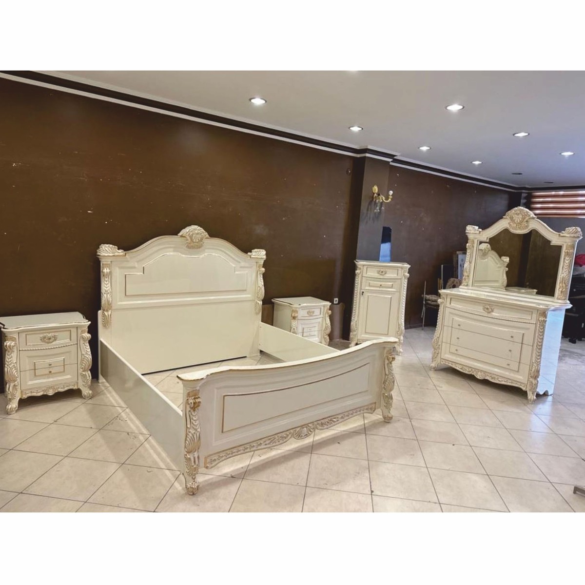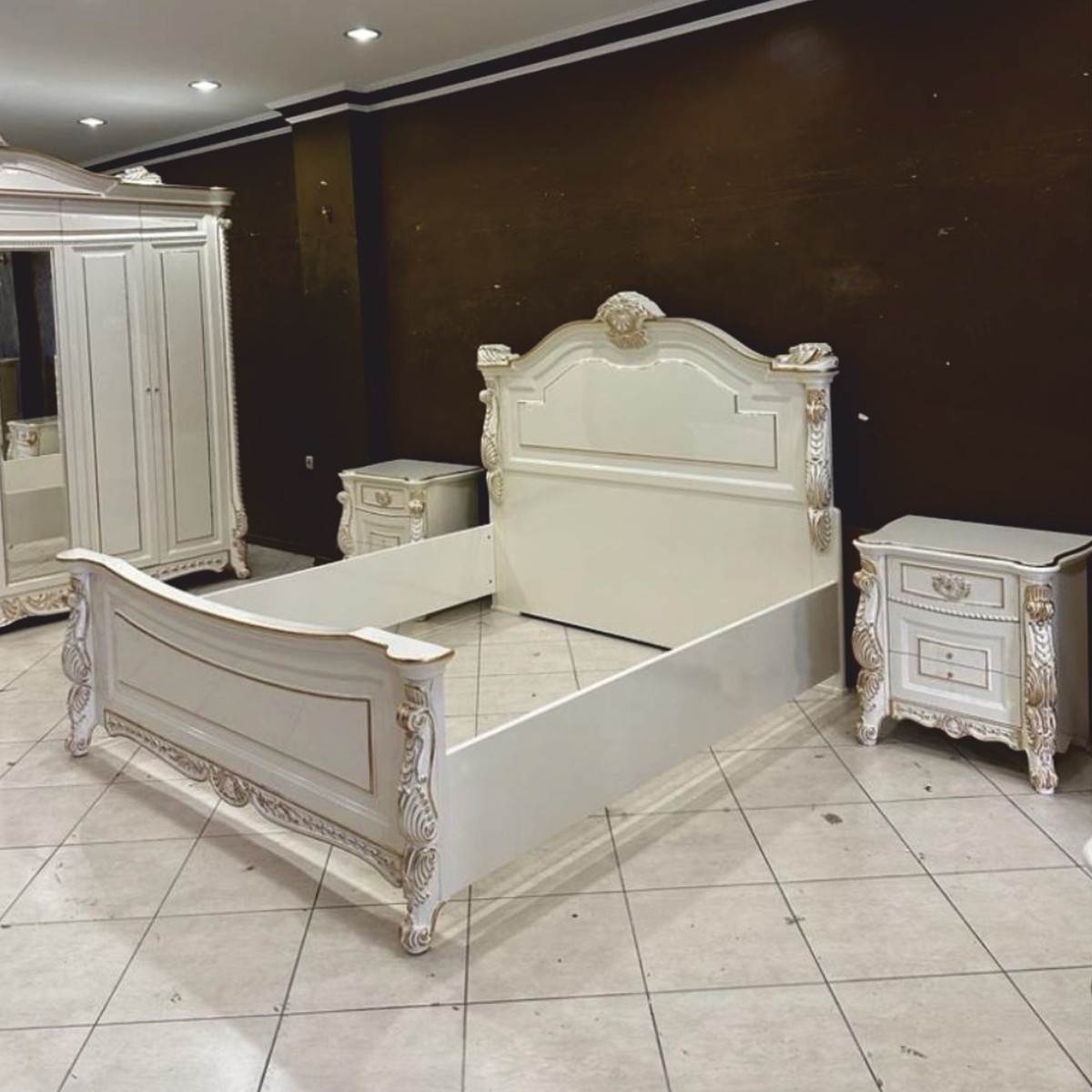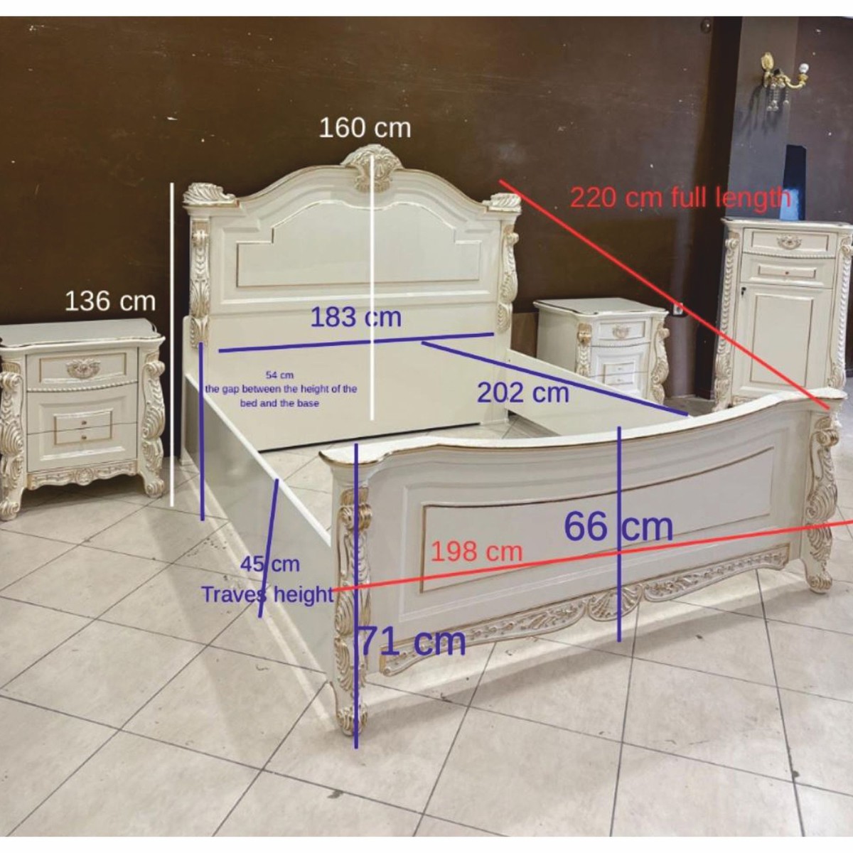 Realizzato in legno massello di alta qualità e rifinito in un elegante bianco con accenti dorati, il letto colpisce per la sua raffinata scelta di materiali e la sua presenza maestosa. I dettagli finemente lavorati e gli elementi decorativi armoniosamente integrati sottolineano il carattere opulento di questo capolavoro barocco.