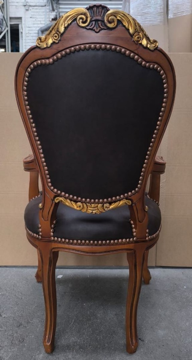 Casa Padrino Luxus Barock Leder Esszimmer Stuhl mit Armlehnen Schwarz / Braun / Gold H. 108 cm