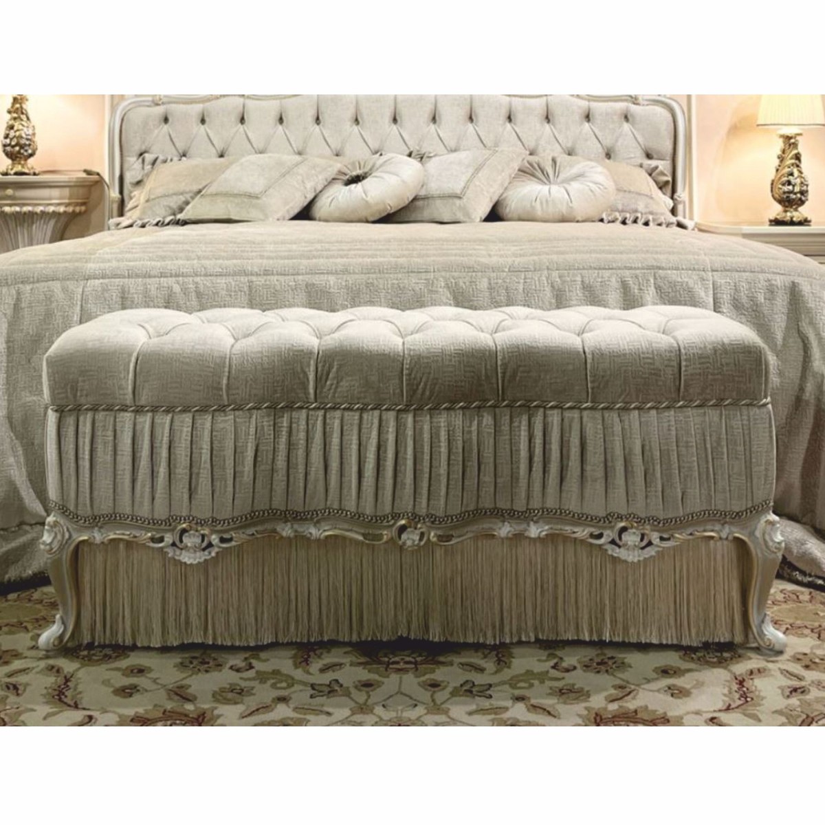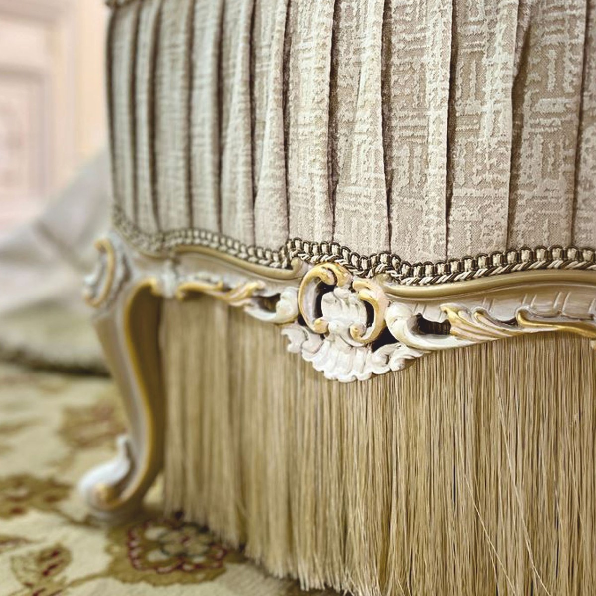La panca si presenta in un'armoniosa combinazione di bianco e oro, sottolineando in modo impressionante il suo carattere barocco. La struttura realizzata a mano affascina con ornamenti elaborati e linee delicatamente curve, conferendole una nobiltà distintiva. La sua lavorazione artigianale di precisione e l'utilizzo di materiali di prima qualità creano un mobile che incarna lusso e stile ai massimi livelli.