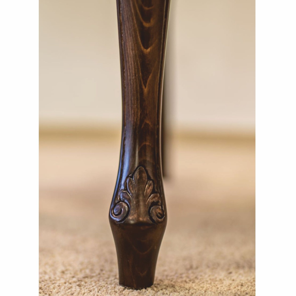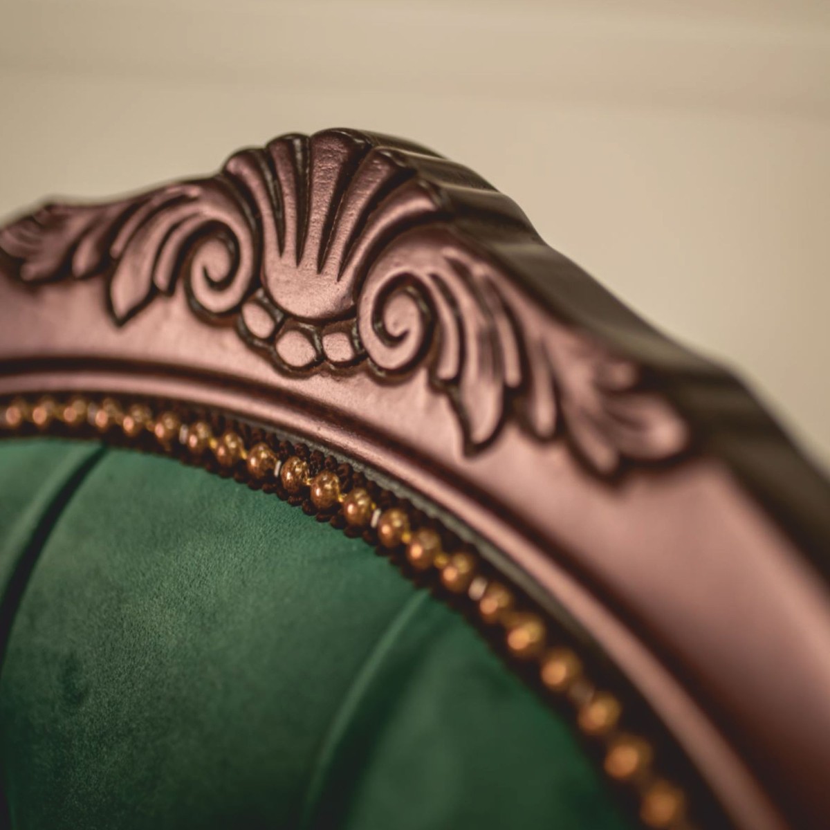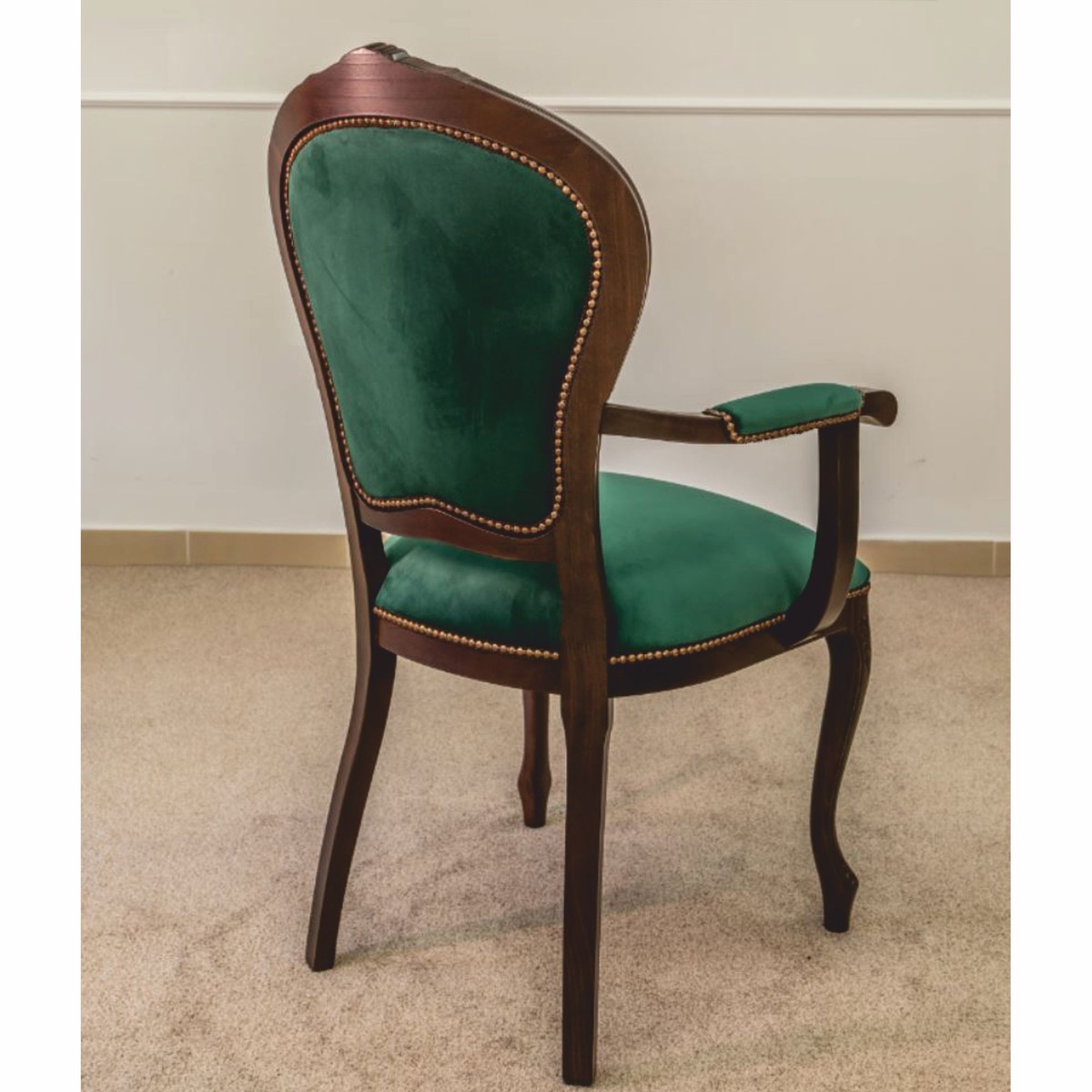 La sedia è rivestita in velluto verde, la cui trama fine e le intense sfumature di colore creano un'atmosfera raffinata, quasi regale. La struttura in legno massello marrone scuro accentua le linee sapientemente curve e conferisce alla sedia una presenza distinta che aggiunge un tocco di stile a qualsiasi interno.
