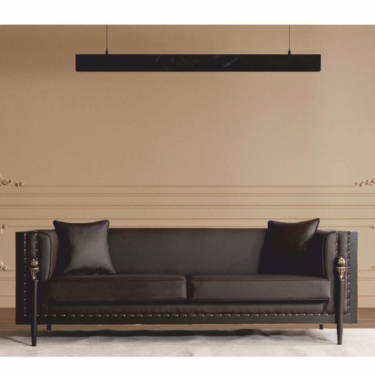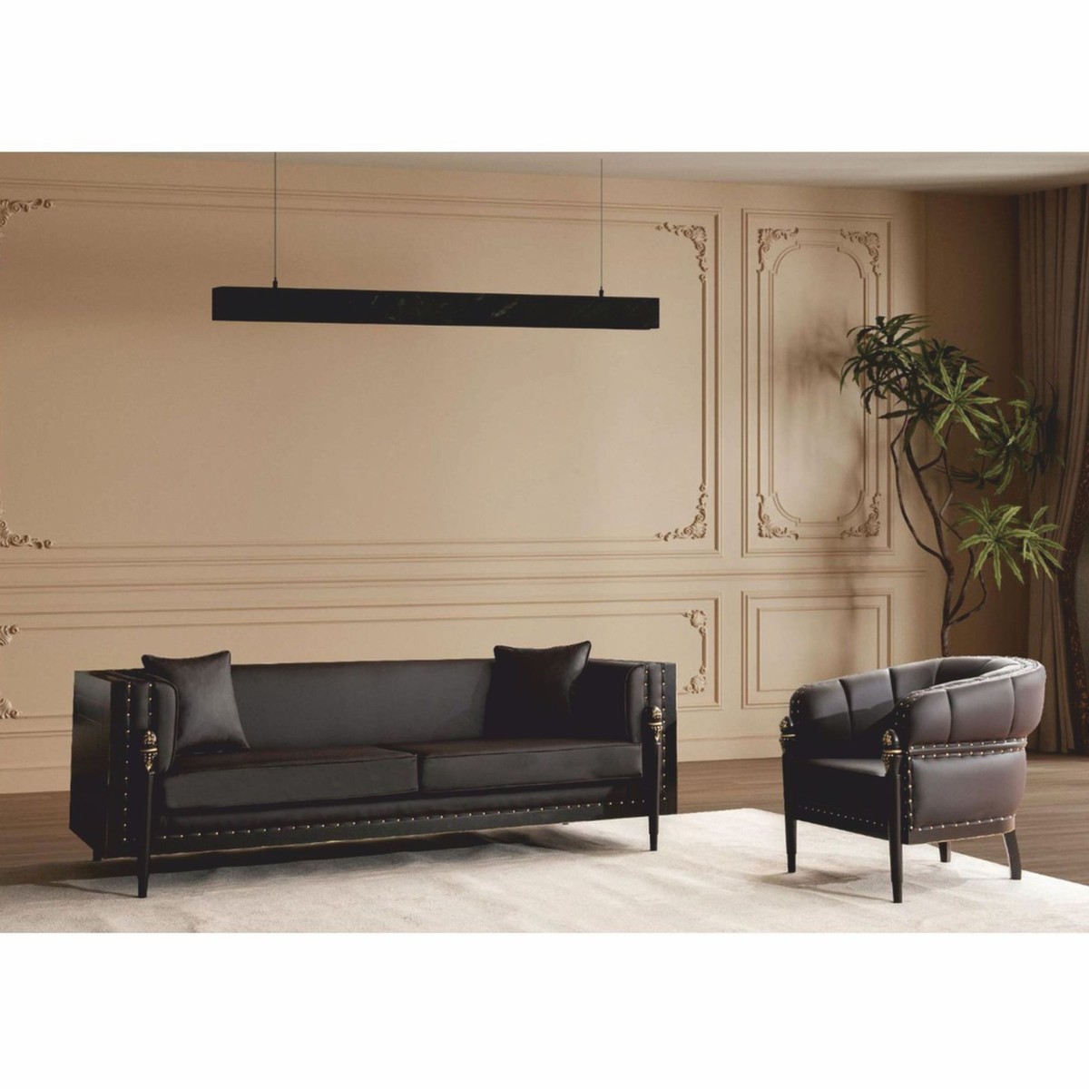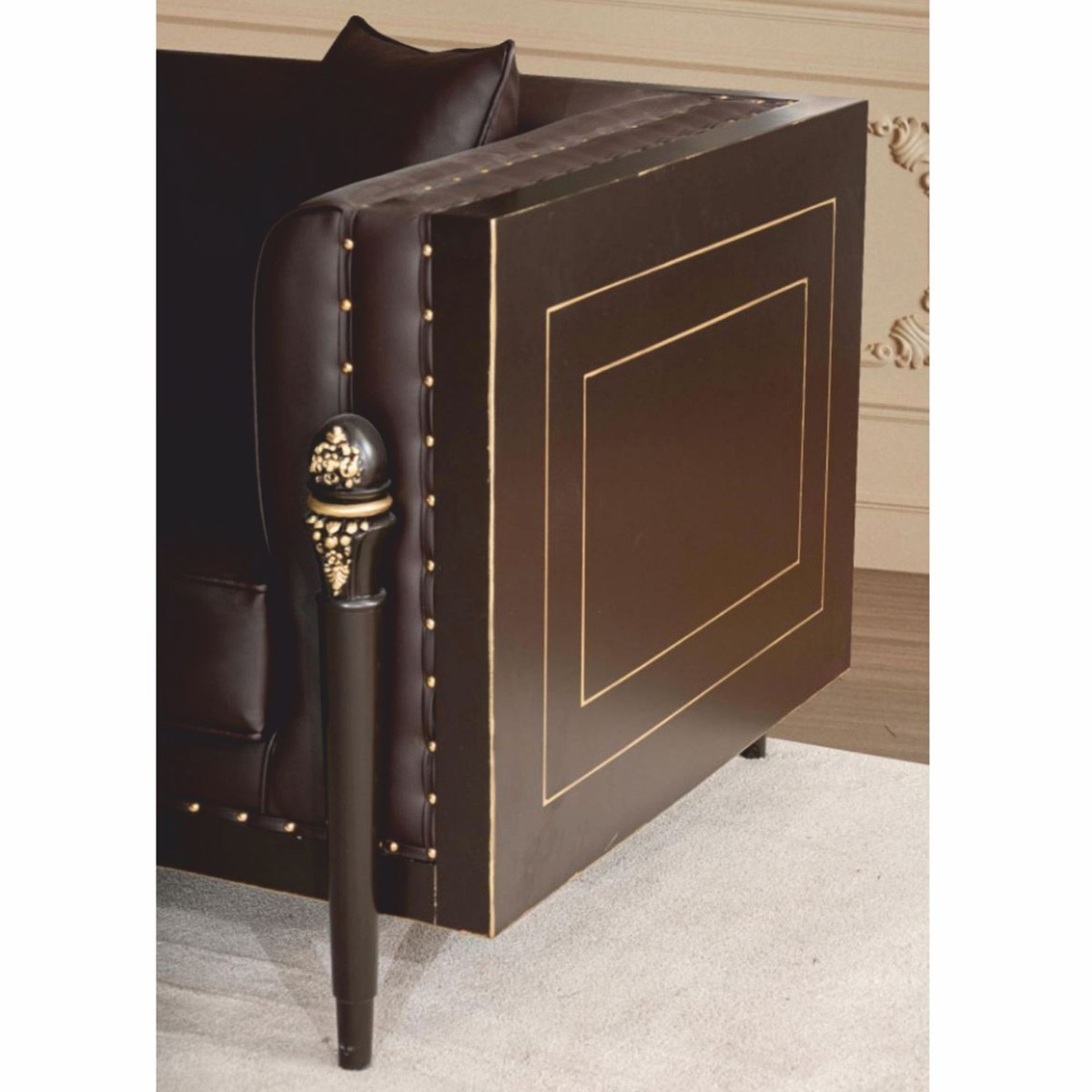 Rivestito in eleganti tonalità marrone scuro e oro, il set da soggiorno emana un'atmosfera calda e lussuosa. I colori armoniosamente coordinati e i dettagli sapientemente lavorati sottolineano il caratteristico stile barocco e conferiscono al set una presenza particolarmente maestosa. Il set è disponibile anche in altre varianti di colore su richiesta e può essere adattato individualmente a diversi stili di arredamento.