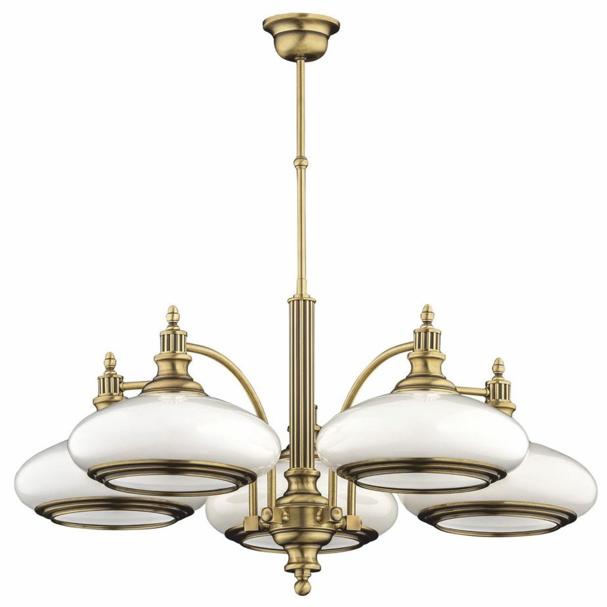 Fünf fein gearbeitete, runde Glaslampenschirme in Weiß sorgen für eine weiche, gleichmäßige Lichtverteilung und verleihen jedem Raum eine einladende Atmosphäre. Der harmonische Kontrast zwischen glänzendem Metall und sanftem Glas unterstreicht die Raffinesse dieses Lichtobjekts und macht es zum zentralen Gestaltungselement in exklusiven Interieurs.